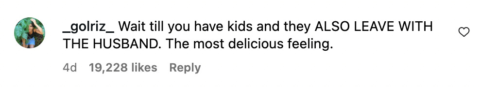 My note was basic - Wait till you have kids and they ALSO LEAVE WITH THE HUSBAND. The most delicious feeling.